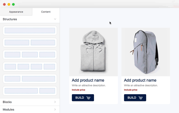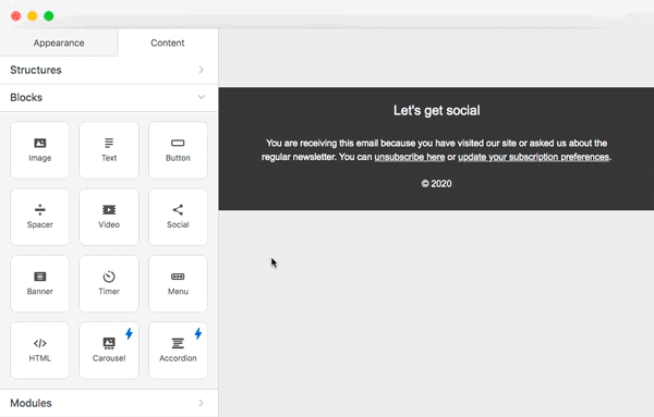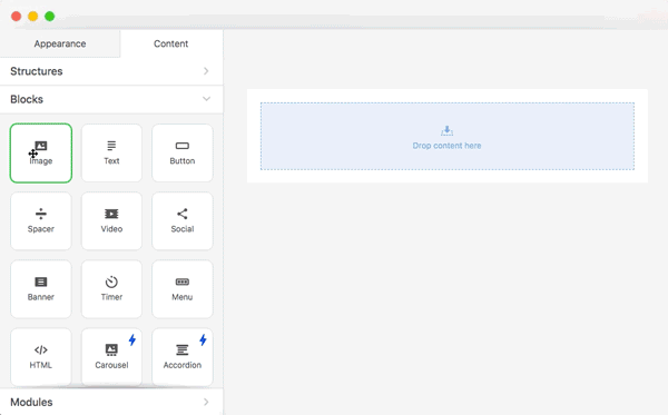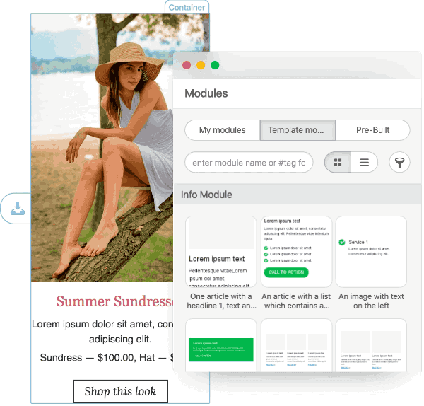 Use modules (content elements designed by us or you) to reduce repetitive work. Simply drag the necessary ones from the Modules to your template.
